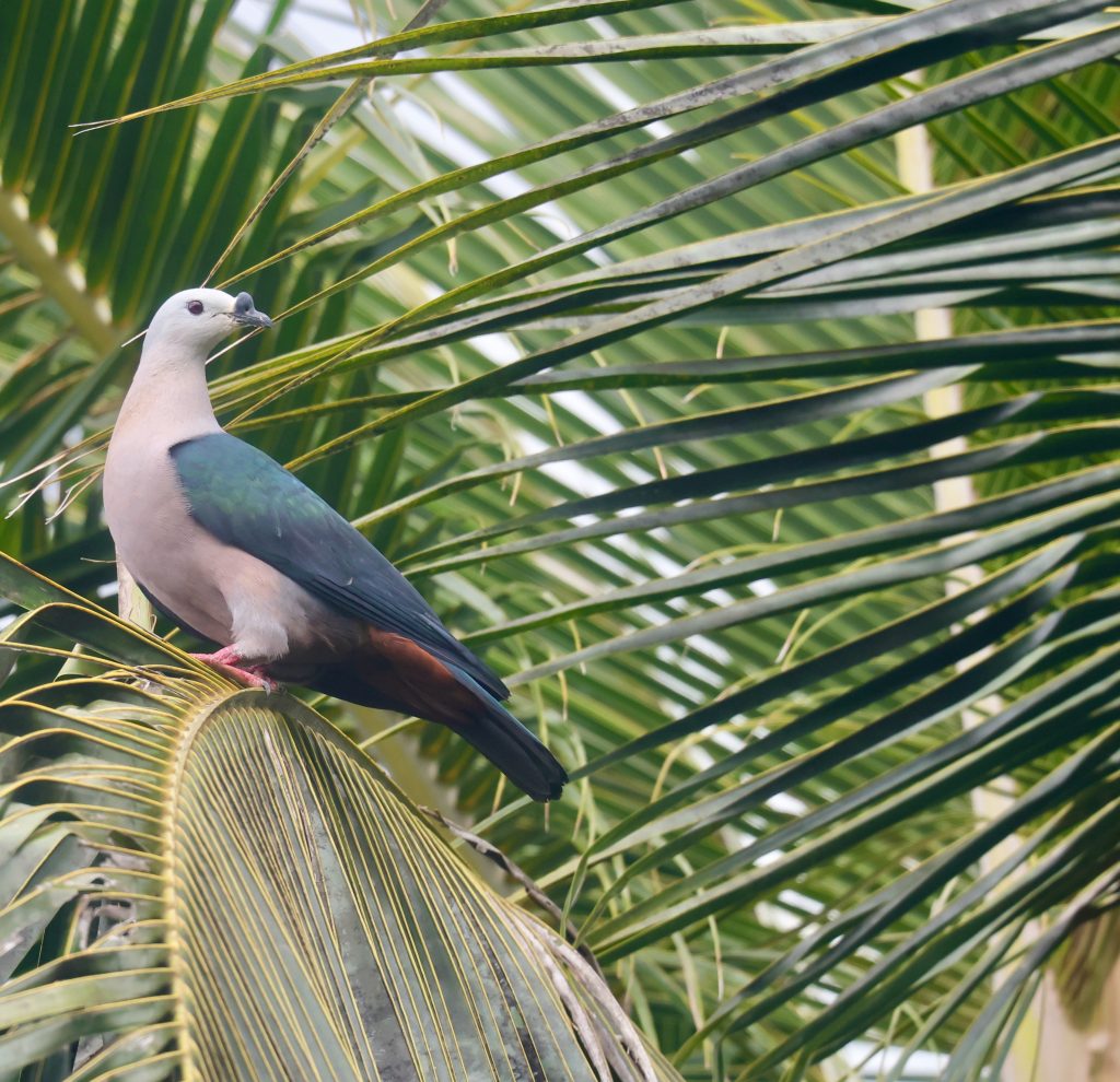 Resident Birds: Claret-breasted Fruit Dove / Red-bellied Fruit Dove / Pacific Imperial Pigeon / Metallic Pigeon / Melanesian Flycatcher / Melanesian Whistler / Collared Kingfisher / Silvereye / Fan-tailed Gerygone / Grey Fantail / Streaked Fantail / Southern Shrikebill / Pacific Robin / South Melanesian Cuckooshrike / Long-tailed Triller / Polynesian Triller / White-breasted Woodswallow / Common Waxbill / Blue-faced Parrotfinch / Chestnut Munia / Chestnut-breasted Mannikin / Shining Bronze Cuckoo / Black-naped Tern / Sooty Tern / Bridled Tern / Greater Crested Tern / Brown Noddy / Black Noddy / White-tailed Tropicbird / Lesser Frigatebird / Great Frigatebird / Coconut Lorikeet.